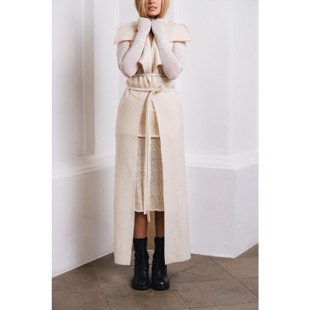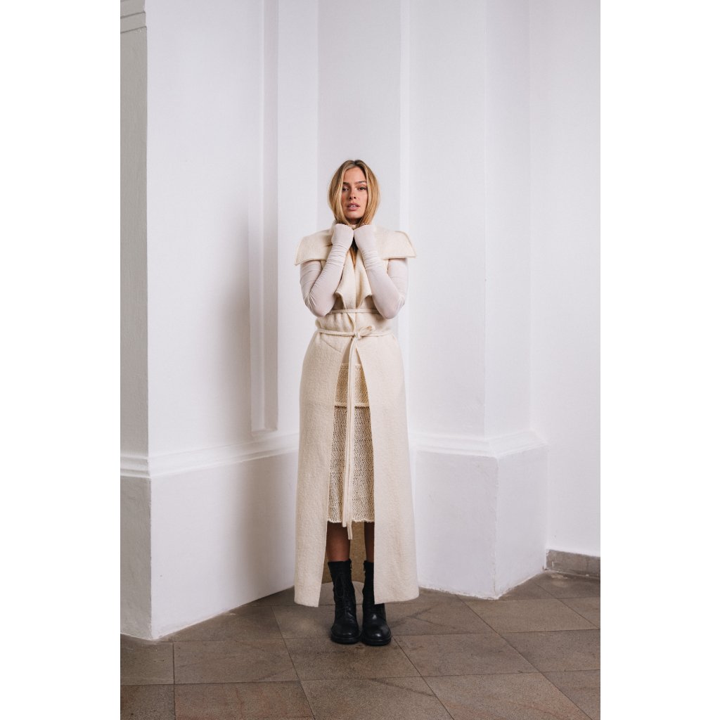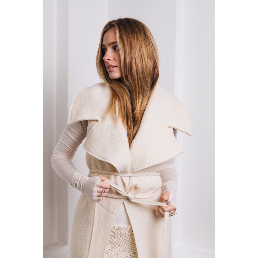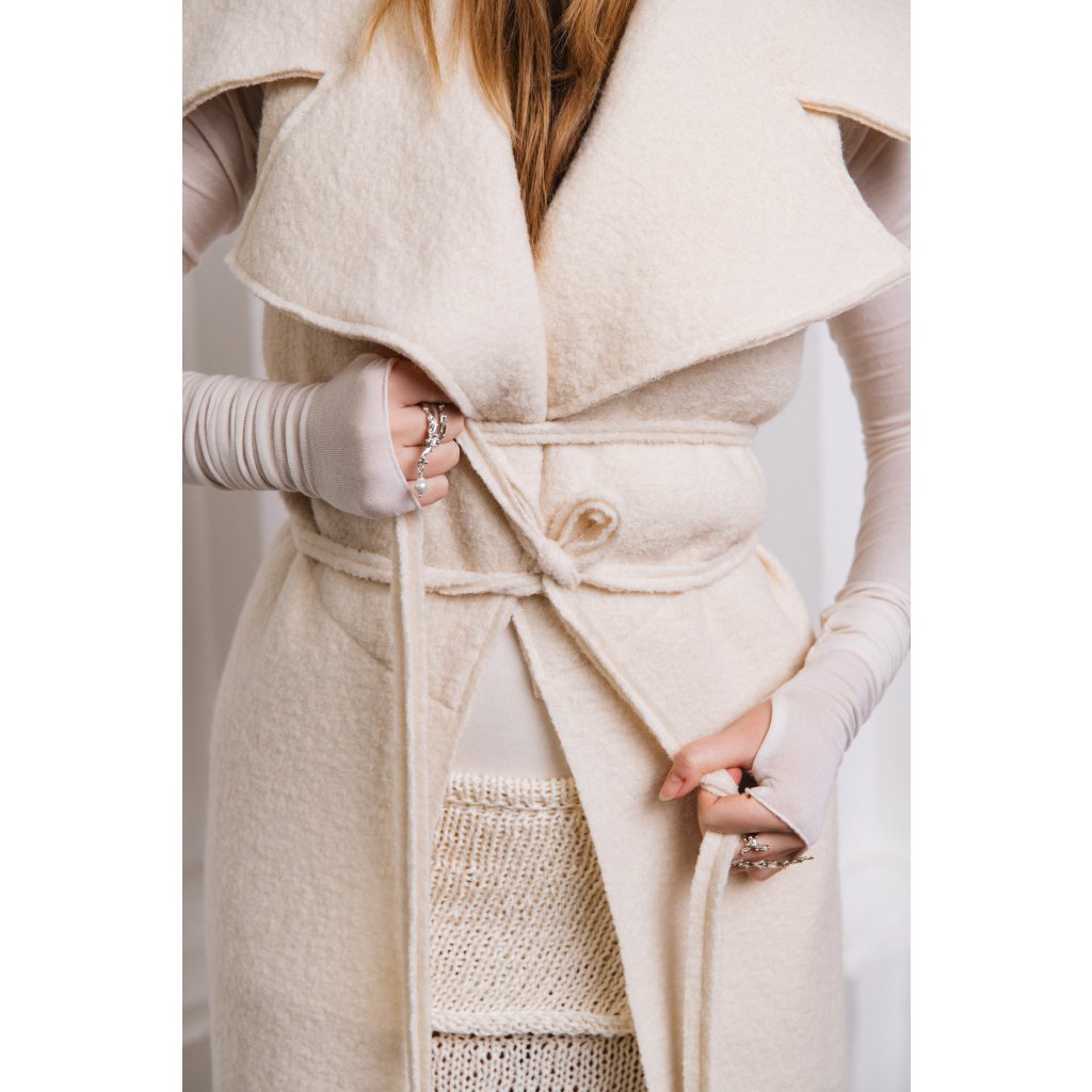 Vesta má veliký límec, je úzkého střihu, který se v přední části rozevírá do stran. Hluboké průramky, bez kapes, úzký dlouhý pásek je součástí. Chrání především hrudník a trup. Je pravým opakem kabátu SERENITY. Když produkty obléknete společně, zima vás nedoběhne.Oba produkty k sobě můžete, knoflíky v předním díle, spojit a svázat páskem.