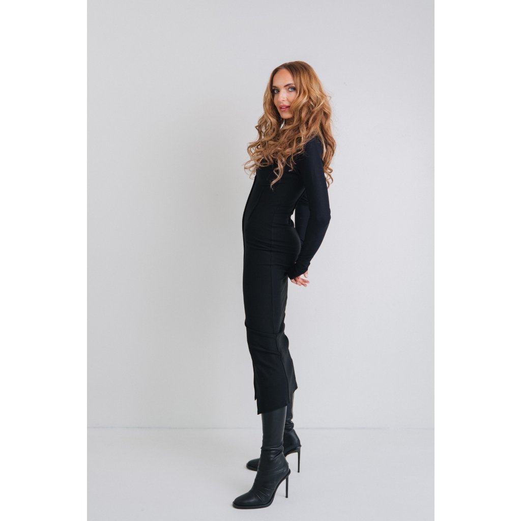 NAOMI úzké úpletové pružné šaty s hlubokým výstřihem a rozparkem. S extra úzkým a dlouhým elastickým rukávem.