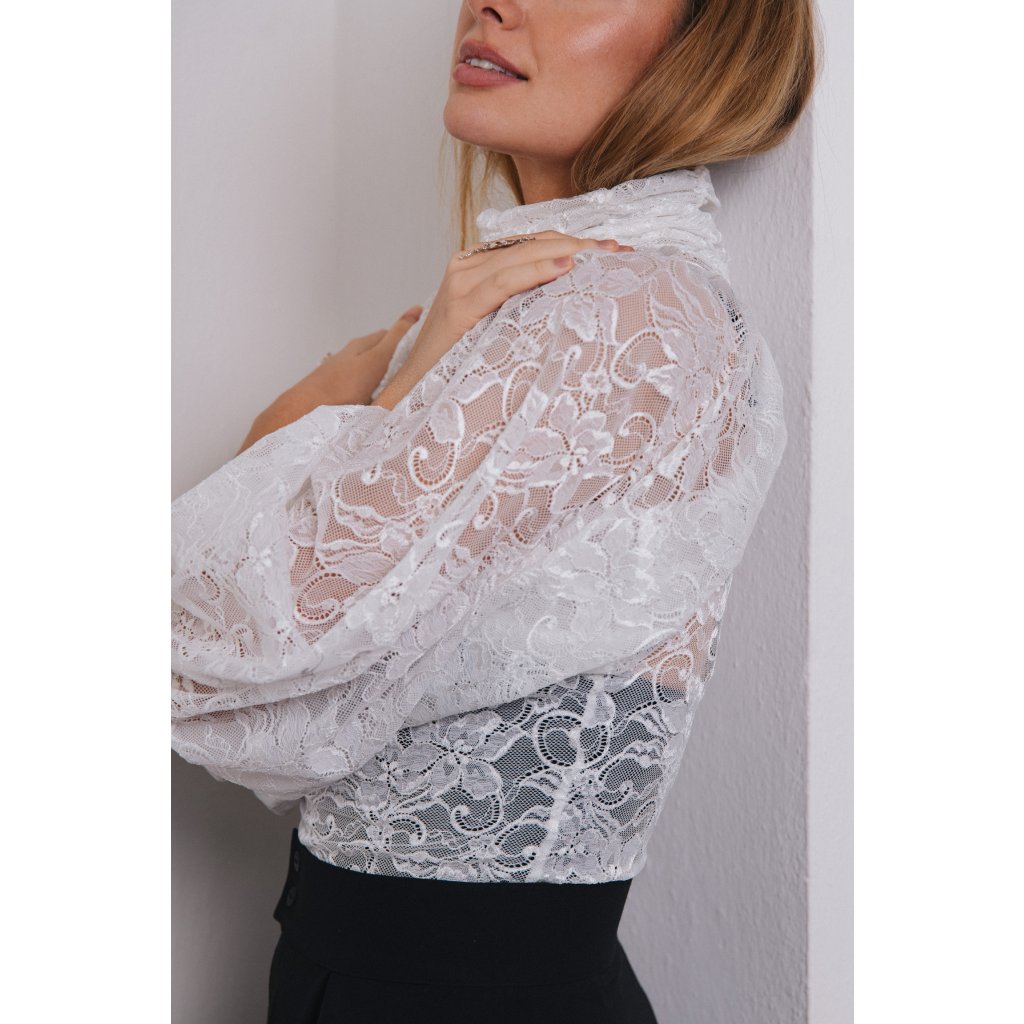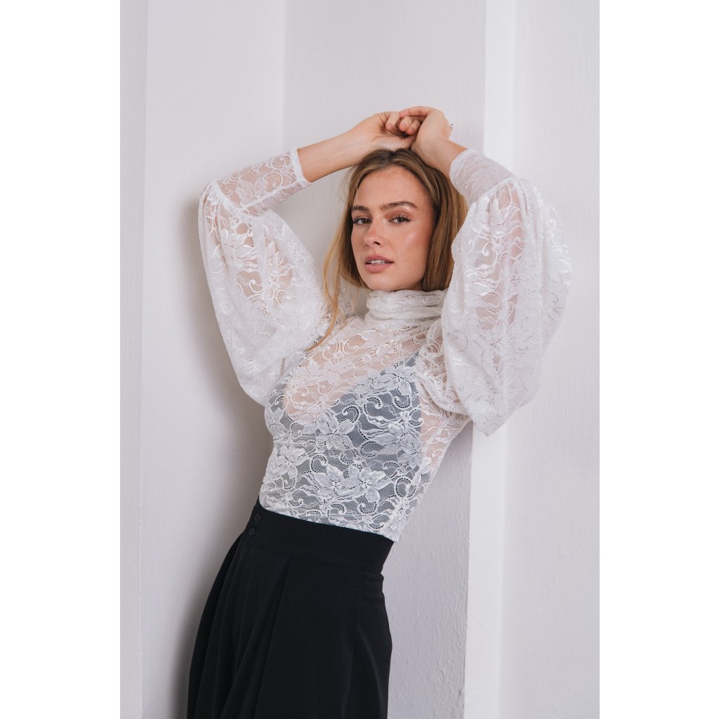 Rolák na krku vysoký s nabíráním, rukávy nabírané do úzké dlouhé manžety. V těle úzký.